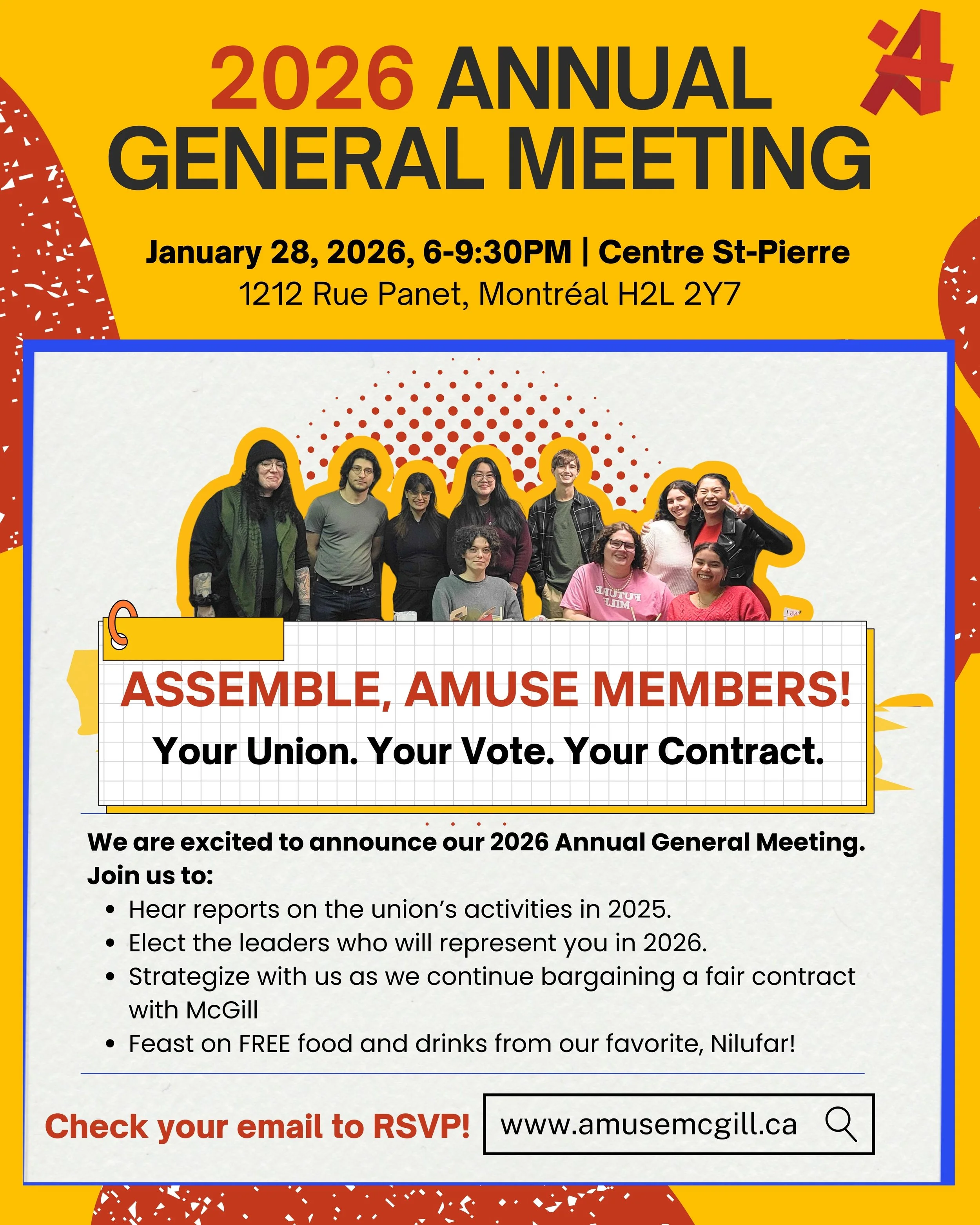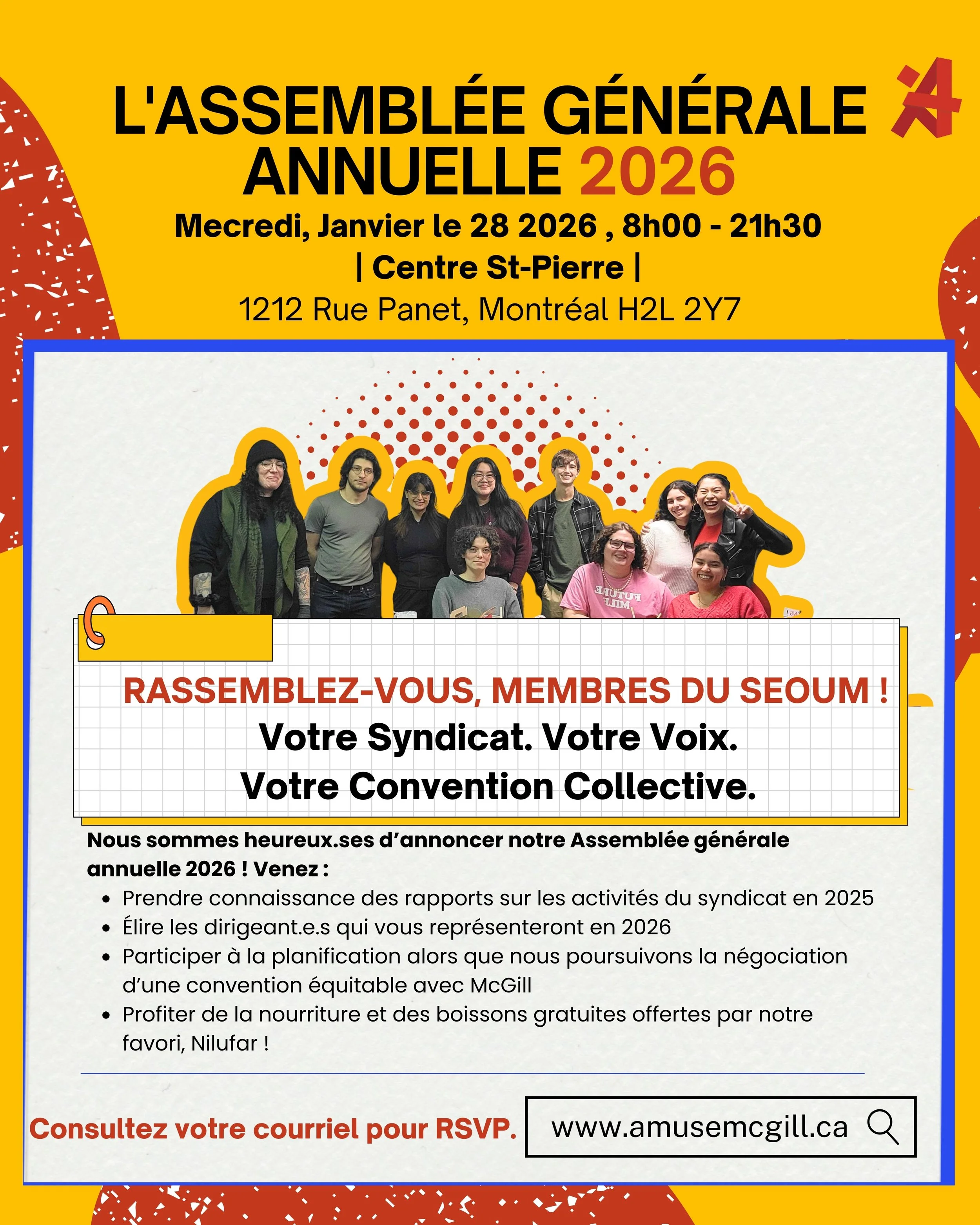 Our Annual General Meeting will be held on Wednesday, January 28th 2026 in person at Centre Saint-Pierre and, if needed, members can join virtually on Zoom. The registration to attend virtually will be sent at a later date.